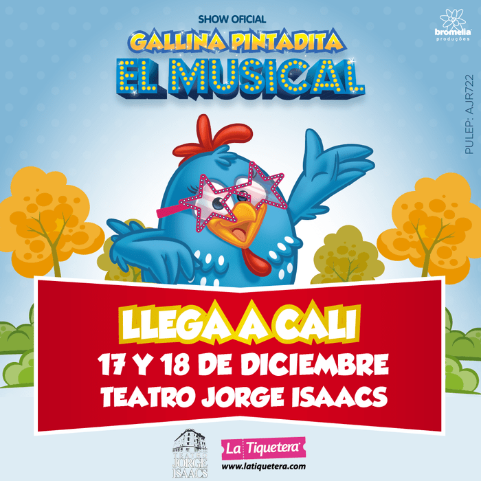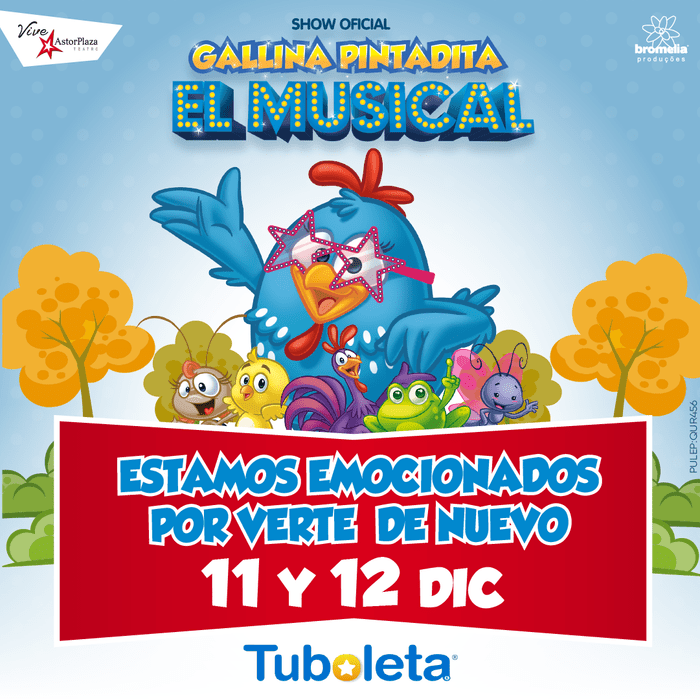 El Show musical de » La Gallina Pintadita» vuelve a ser el principal protagonista de esta temporada. En este mágico espectáculo, lleno de color y mucha diversión, personajes como: El Pollito Amarillito, El Gavilán, El Sapo, La Cucaracha, El Gallo Coroco, y La Mariposita. serán los responsables de hacerte vivir una tarde inolvidable gracias a que su único fin es brincar y cantar sin parar.