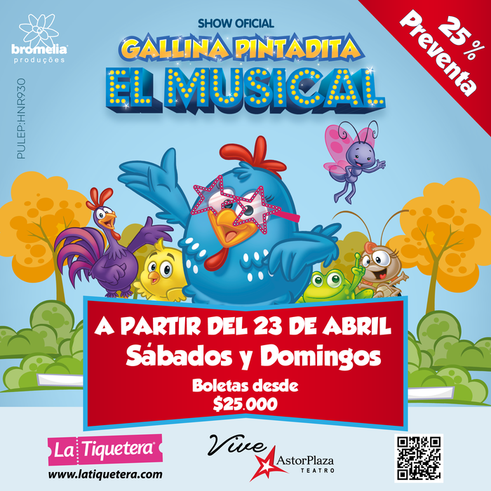 El Show musical de » La Gallina Pintadita» vuelve a ser el principal protagonista de esta temporada. En este mágico espectáculo, lleno de color y mucha diversión, personajes como: El Pollito Amarillito, El Gavilán, El Sapo, La Cucaracha, El Gallo Coroco, y La Mariposita. serán los responsables de hacerte vivir una tarde inolvidable gracias a que su único fin es brincar y cantar sin parar.
