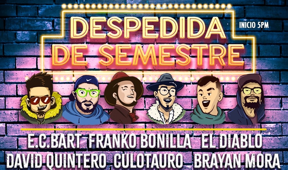 Despedida de Semestre 2022 presenta a E.C. Bart, leyenda viviente de la escena del Stand up comedy colombiano, parte del elenco de Comediantes de la Noche y Con Ánimo De Ofender. Está en proceso de creación de varios espacios alternativos de la ciudad. Sobresale su autenticidad cargada de carácter y sin filtros. Franko Bonilla, artista excéntrico, de entrega absoluta al público que disfruta de sus historias, posturas y distinguida comunicación verbal contrastada con una imagen caricaturesca y bonachona. Ha visitado escenarios en EEUU y México llevando su autenticidad característica. Jorge Torres El Diablo, juglar de reconocimiento internacional, finalista de Sábados Felices y uno de los mayores actores cómicos del país. Tiene un espectáculo para grandes y chicos con una sonoridad paisa que le brinda a este comediante todo lo necesario para hacer de cada una de sus rutinas, un show memorable.