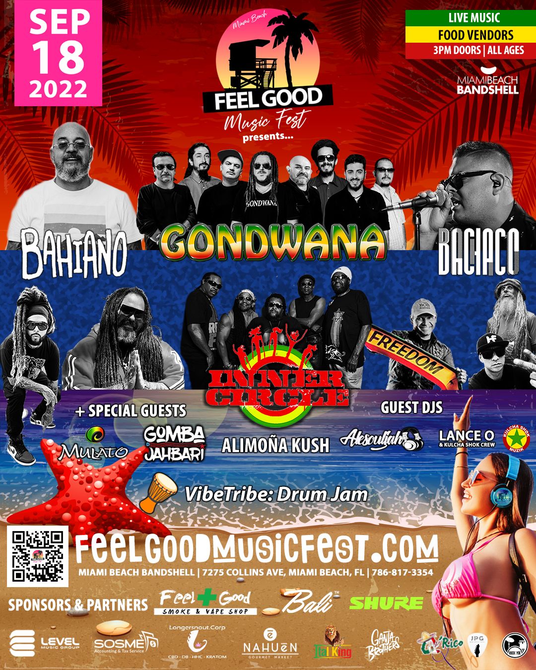 El concierto para todas las edades en el Miami Beach presentara a Bahiano (Argentina), Gondwana (Chile), Bachaco (Venezuela), e Inner Circle (Jamaica) además de invitados especiales Gomba Jahbari (Puerto Rico), Mulato (Venezuela), ¡y mucho más!