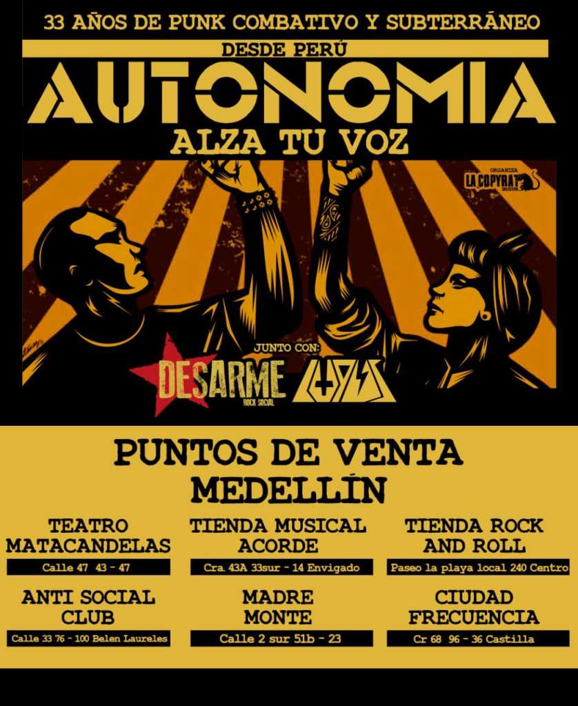 Así, Autonomía, con su punk combativo y subterráneo, visitará Colombia en el marco de la gira ‘Alza tu Voz’, organizada por LaCopyRat Colectivo, en la cual se presentará en Bogotá y Medellín, el 2 y 3 de diciembre respectivamente.