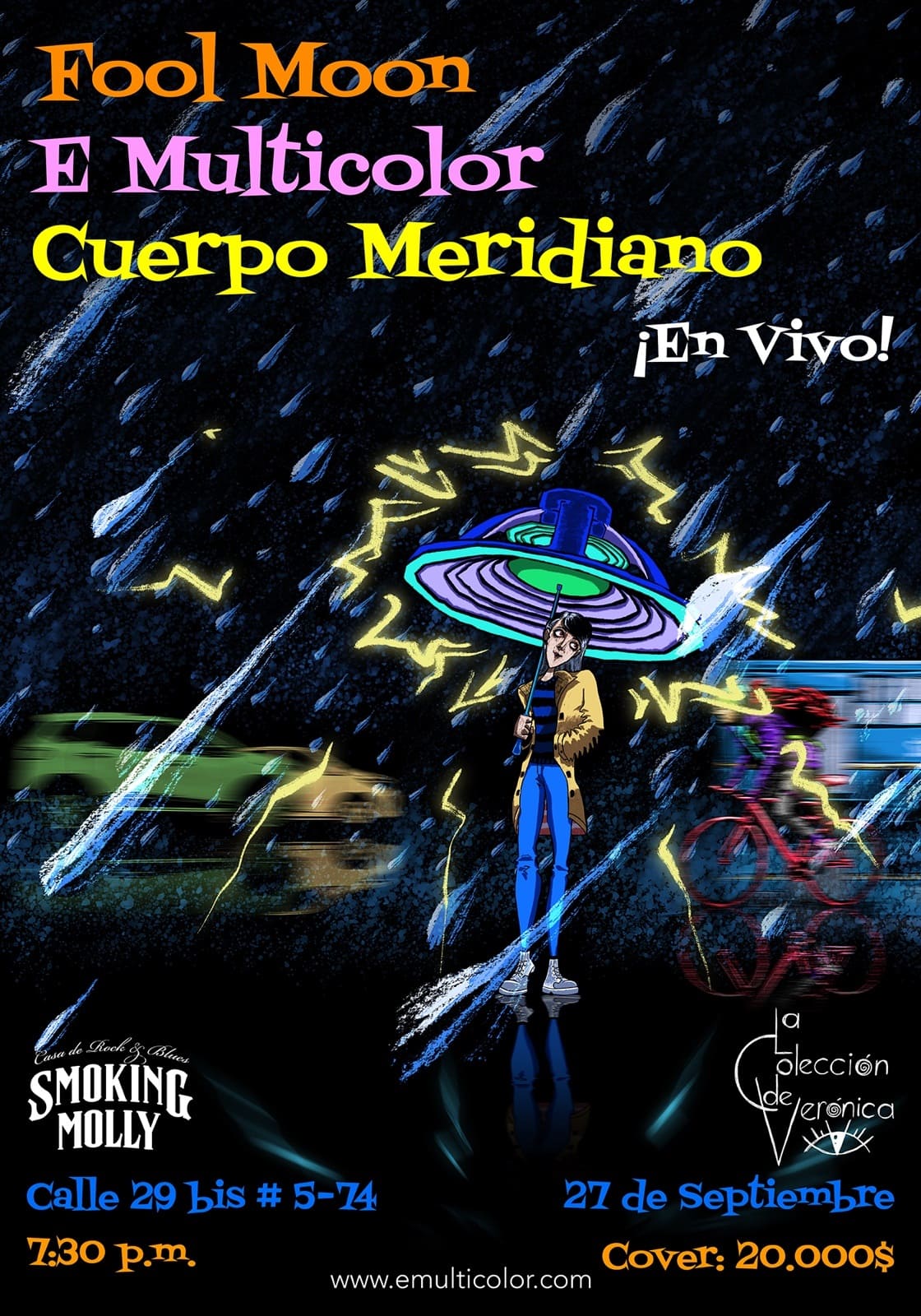 E Multicolor se presentará en vivo en Bogotá el sábado 27 de septiembre en Smoking Molly (Calle 29 Bis # 5-74) junto a las agrupaciones invitadas Fool Moon y Cuerpo Meridiano. El evento tiene un valor de $20.000. Será una noche para escuchar propuestas variadas y originales, acompañadas de un espectáculo visual de múltiples proyecciones sincronizadas que sirven tanto para impactar como para darle un ambiente único y emocionante al show. También estará presente ‘La Colección de Verónica’, la tienda de objetos artísticos de E Multicolor.
